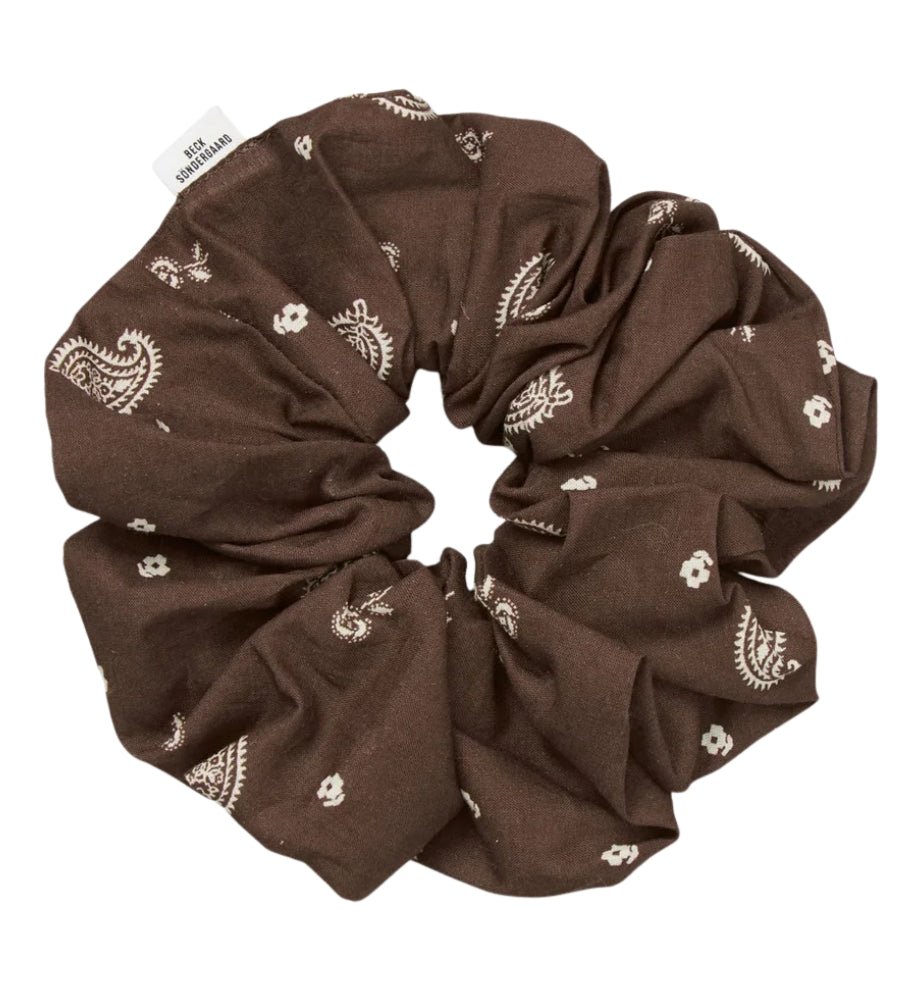 Elevate your hair with the Bloom Paisley Scrunchie by Becksöndergaard. Crafted from 100% cotton, the enchanting paisley pattern in rich chocolate brown adds an effortlessly chic, feminine flair to any hairstyle.