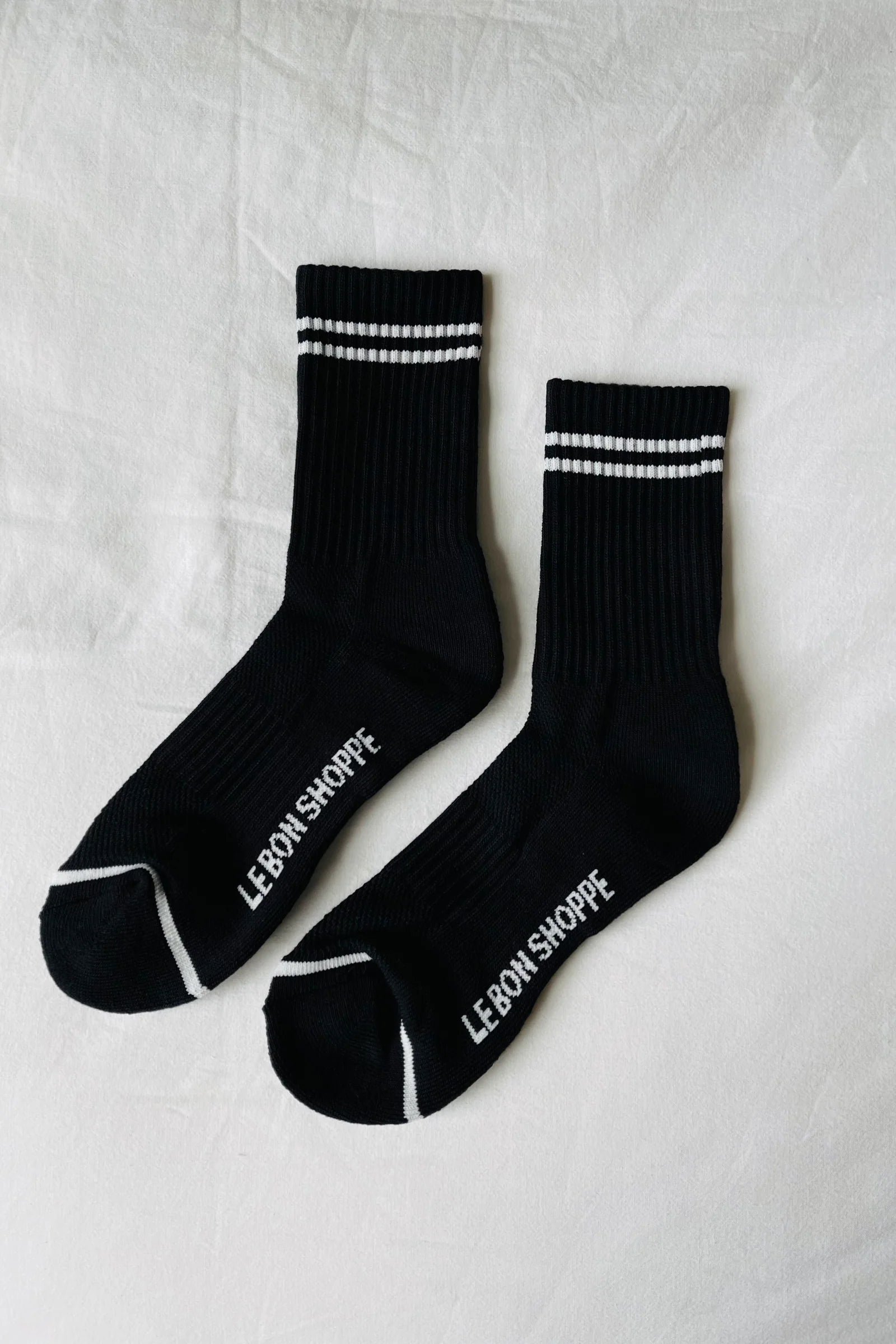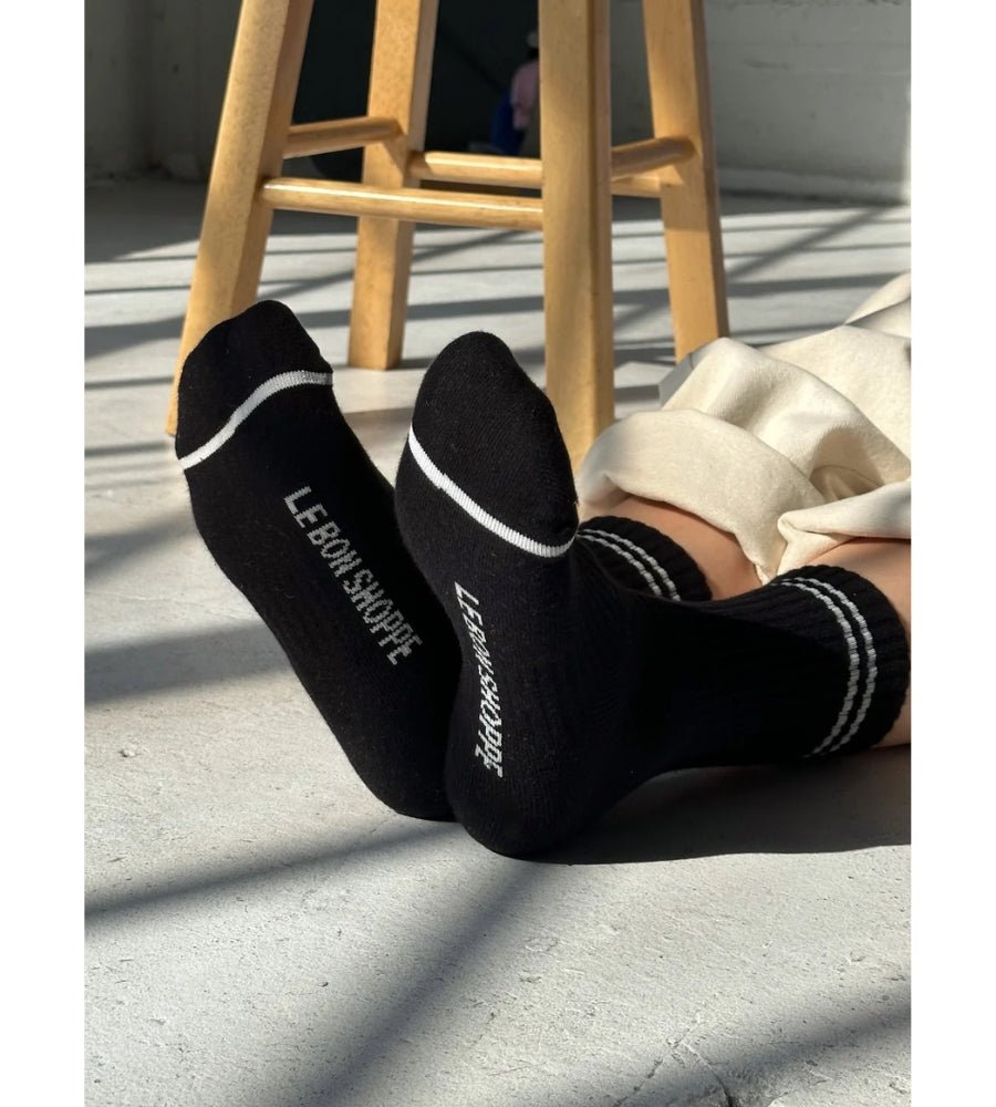 The Boyfriend Socks from Le Bon Shoppe. This slightly longer-than-crew sock features a contrast double stripe. With a sporty charm and playful style, these delightful socks are a fusion of comfort and cuteness. Designed for everyday wear!
