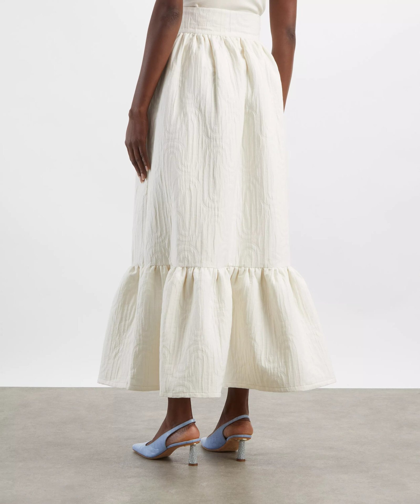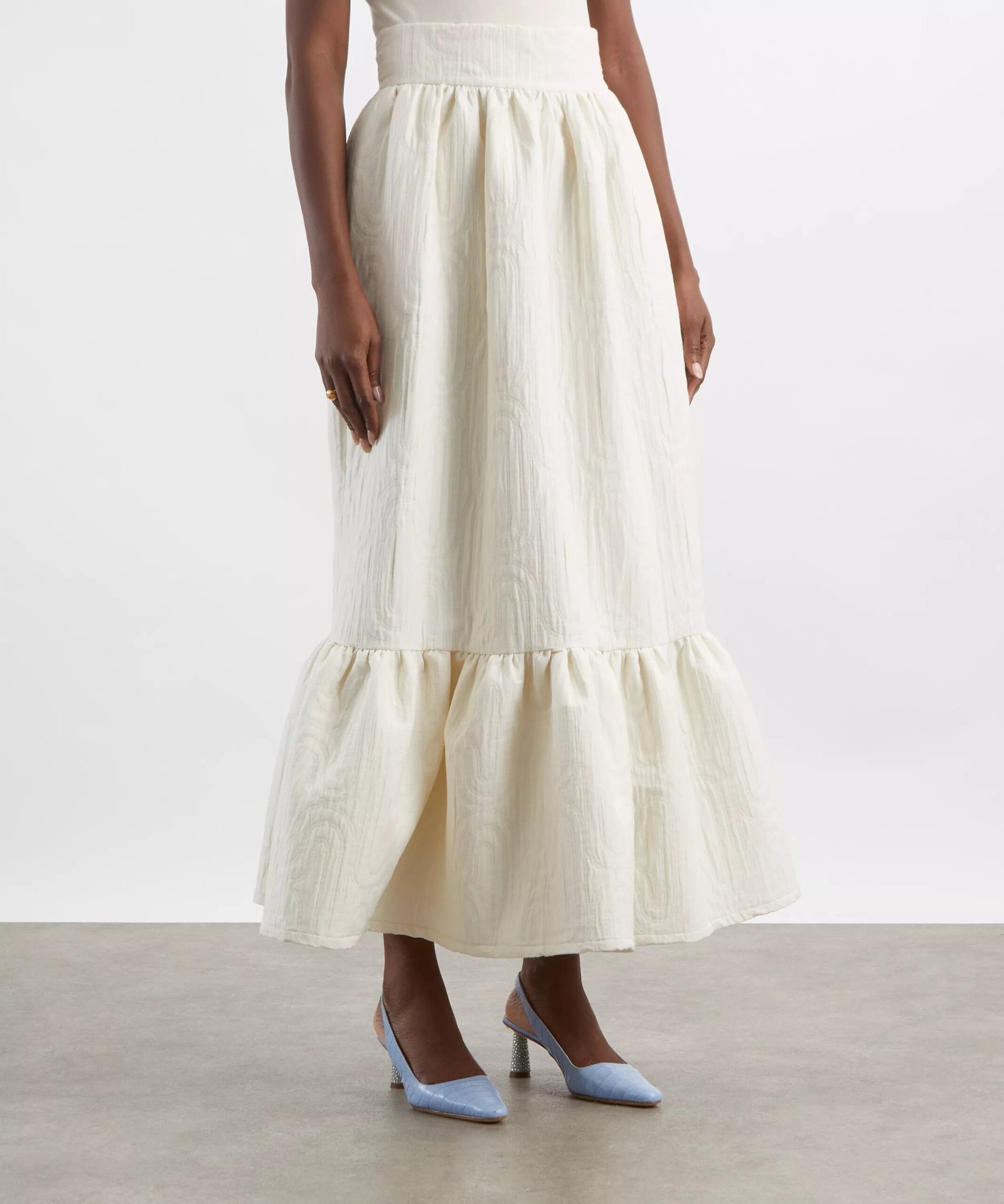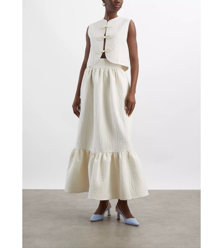 Elevate your wardrobe with this sophisticated embroidered cotton blend maxi skirt. Featuring a flattering high-waisted A-line silhouette and charming peplum hem detail, it offers both style and comfort. The side zip closure ensures an easy fit, while the intricate embroidery adds a touch of elegance to any occasion. Pair with the Vienna waistcoat to create a gorgeous summer co-ord.