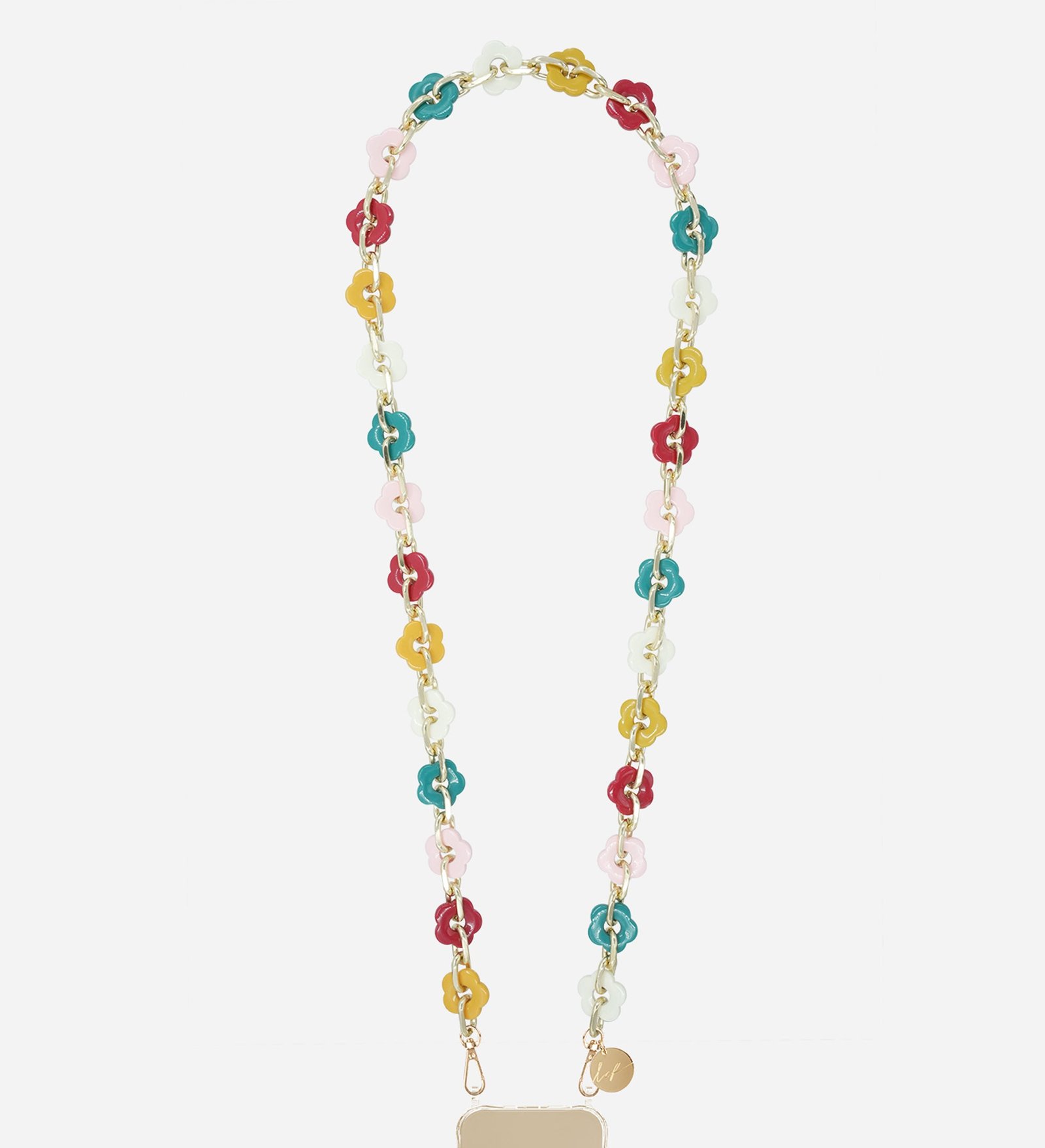 The Cassy phone chain by La Coque Francaise in multicolour flower resin, 120 cm long, clips onto the universal adapter (available separately). The perfect chic and super useful accessory.