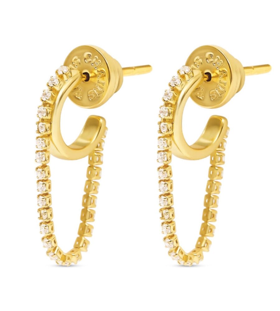 A modern edge meets timeless sparkle. These elevated huggie-style earrings feature a sleek chain link drop that falls just below the lobe, adding subtle movement and a contemporary feel. The huggies are lined with shimmering 5A cubic zirconia stones, offering a refined touch of brilliance. Made from brass and finished in 18k gold plating, they’re secured with a classic butterfly fastening for a comfortable, all-day fit.