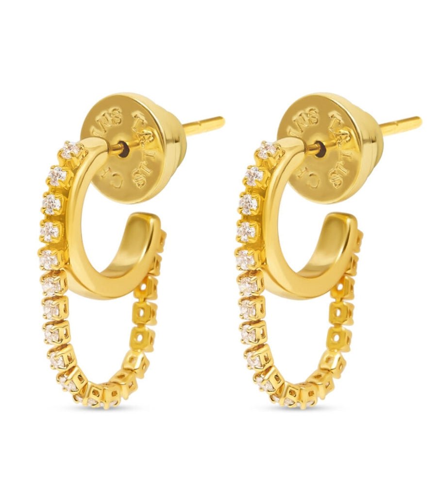 Add a polished edge with a refined silhouette. These gorgeous huggies feature a snug huggie hoop, lined with glittering cubic zirconia, from which a shorter chain‑link drop falls gently below the lobe. Finished in 18k gold plating on brass and secured with a traditional butterfly back, they combine comfort and glamour in one sleek piece. Wear them on its own or stack with other huggies for a curated fashion forward ear stack.
