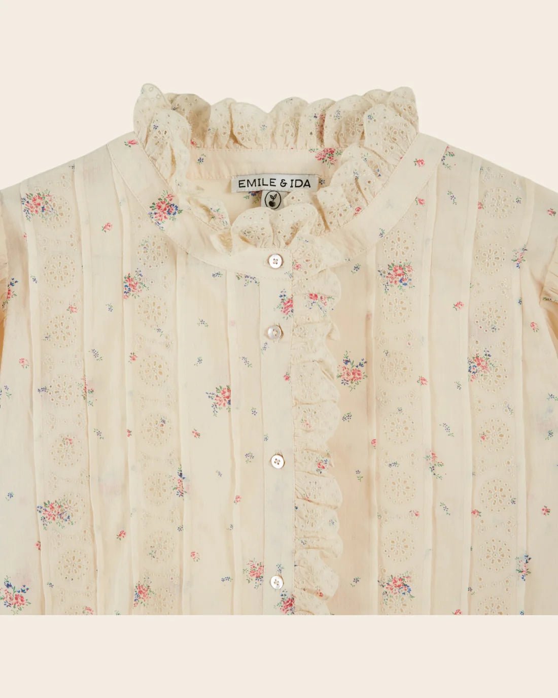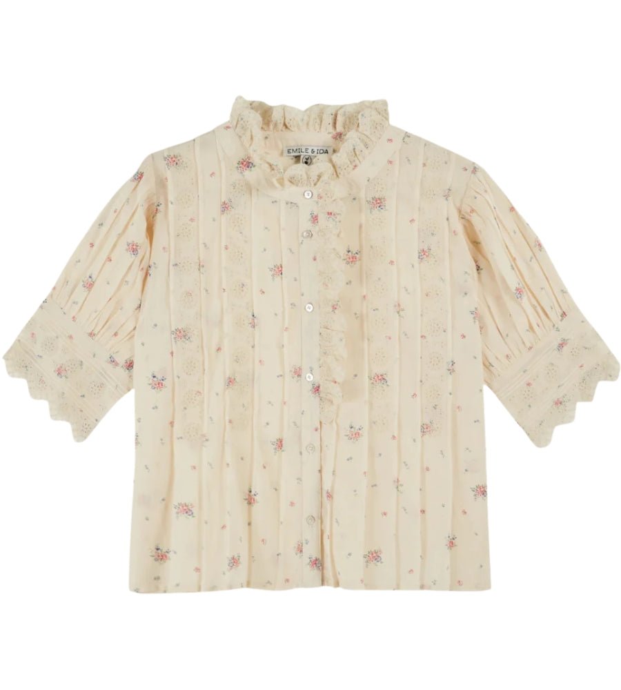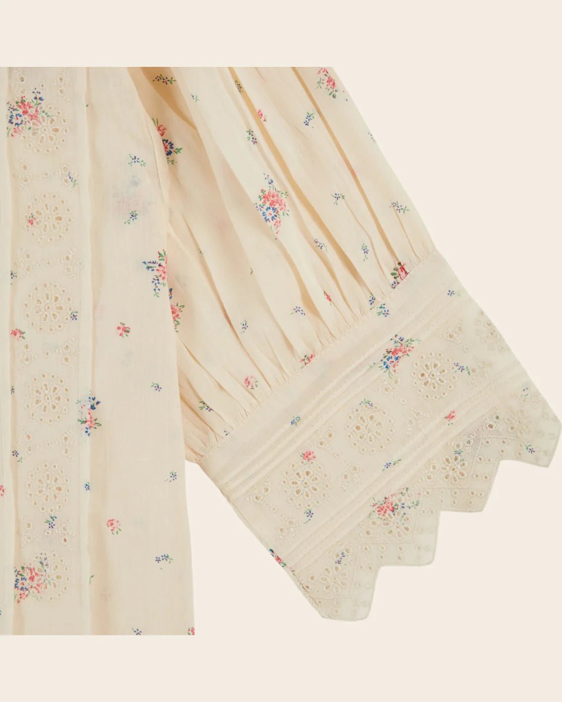 Meet Daphne, your new summer essential. This beautiful blouse pairs soft ecru organic cotton with delicate vintage inspired florals, creating that effortlessly sweet aesthetic. Ruffled English embroidery frames the collar and front, while gathered sleeves with scalloped edges add a playful touch. Finished with natural mother of pearl buttons for that perfect vintage modern blend.