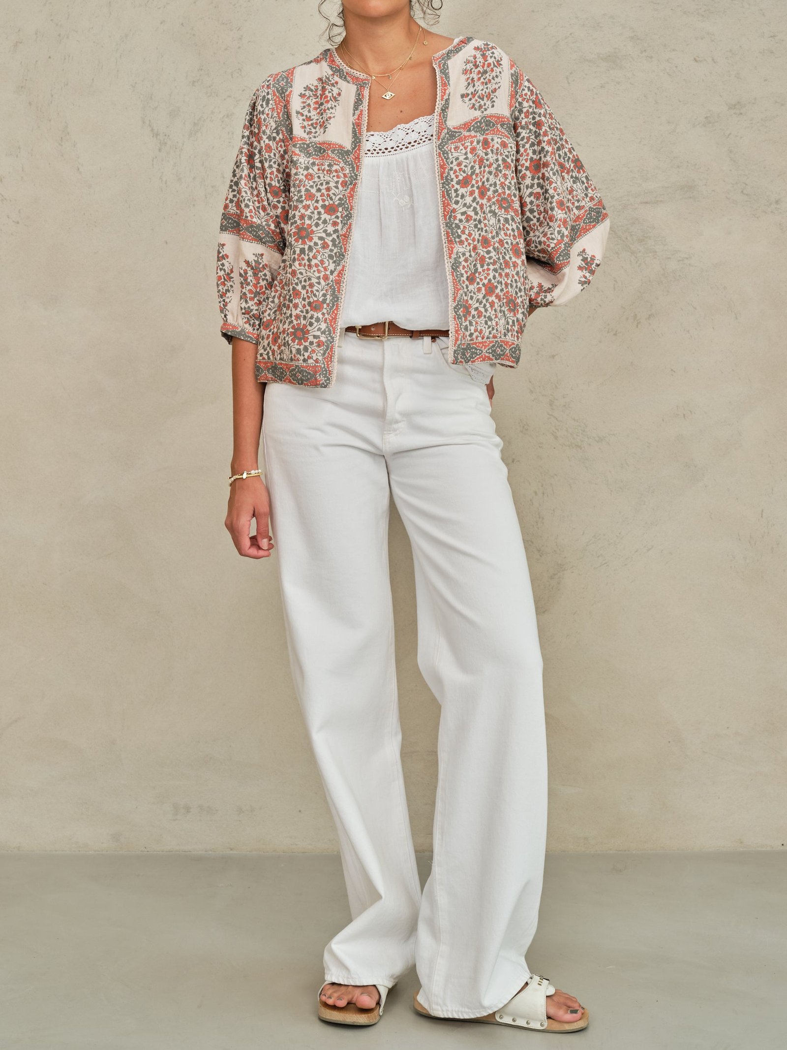 Introducing the Della Print Jacket in a stunning rust and khaki palette. This lightweight layer features a delicate floral print that brings effortless style to any outfit. The 3/4 length sleeves with subtle puff detailing add a feminine touch, while the rounded neckline and straight cut create a flattering, versatile silhouette. Perfect for layering over dresses or pairing with your favourite basics.