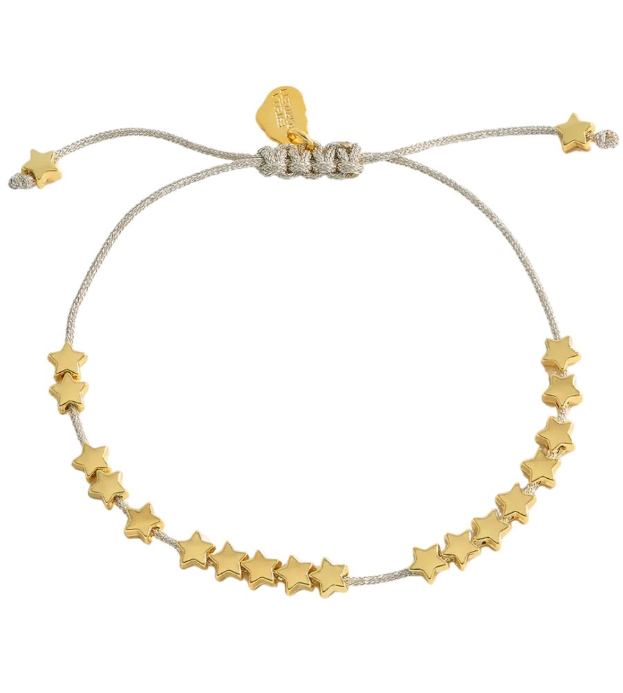 Designed with metallic silver cord and adorned with dainty, gold plated stars. The Stars So Bright bracelet features an adjustable knot fastening perfect for all wrist sizes.