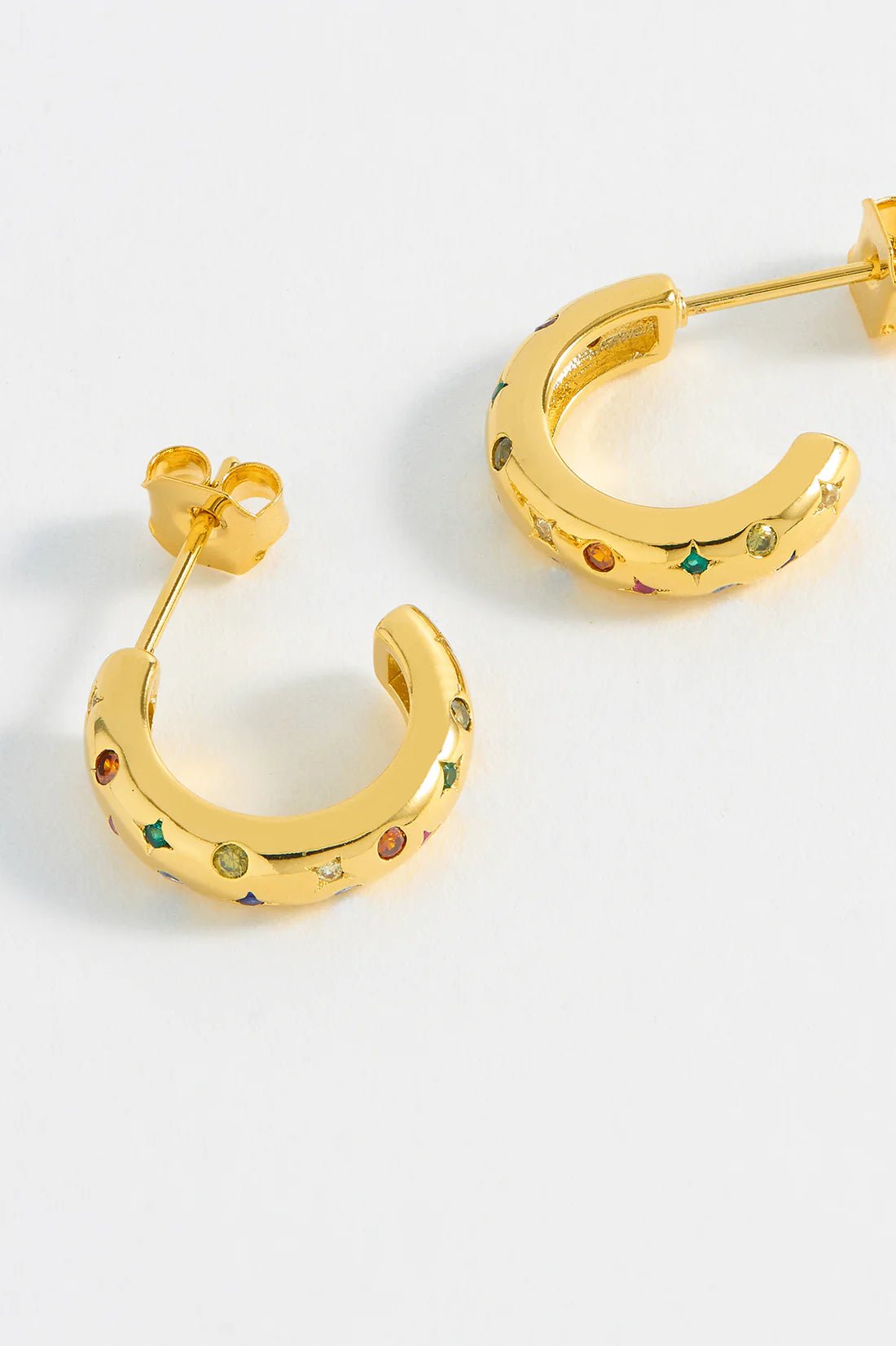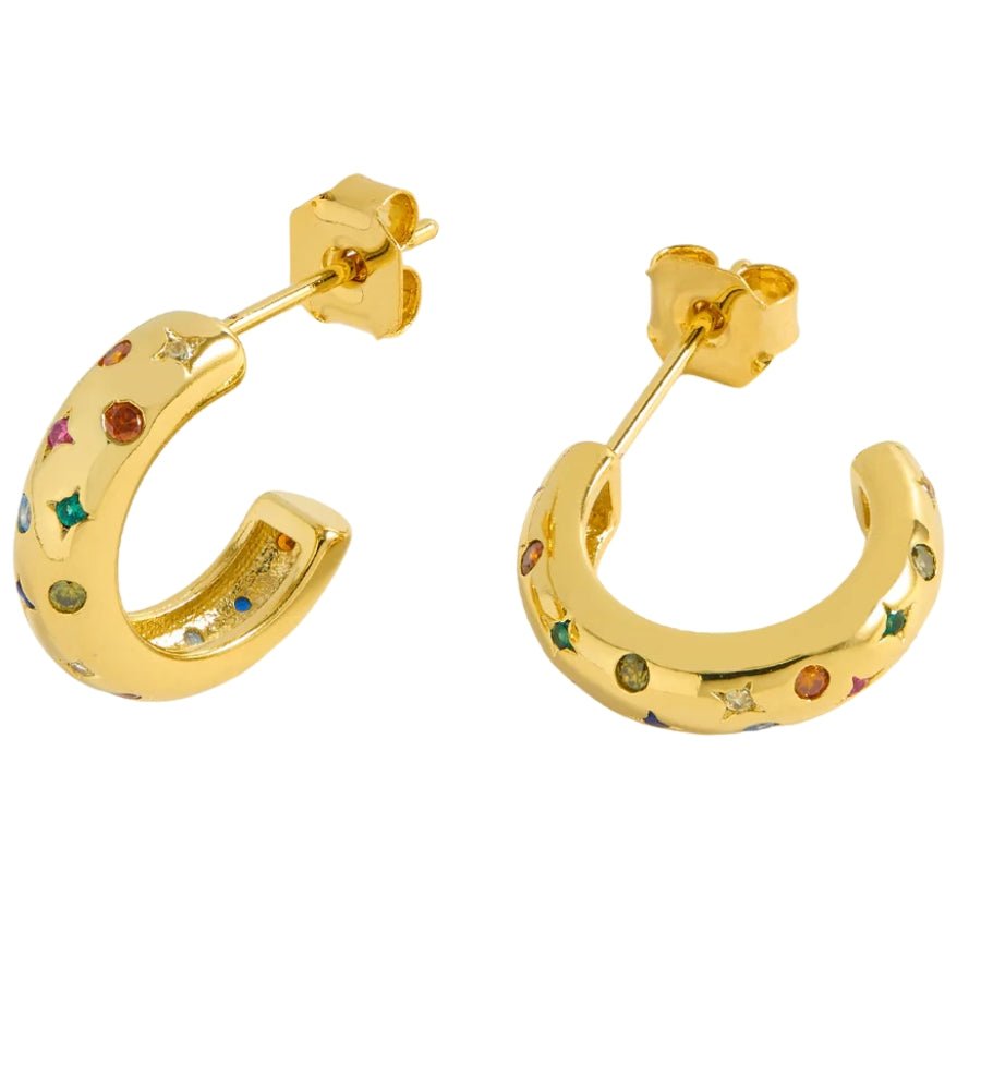 Brighten up your outfit with the gold plated Chubby Rainbow Celestial Hoops. Featuring a small, thick hoop earring with multi-coloured gems, these hoops embody fun, playfulness and joy.