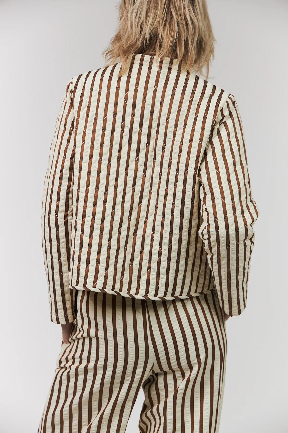 The EmiliaLL is a light and charming jacket with beautiful vertical stripes. The quilted stitching gives the jacket a distinctive look, and the material feels exclusive and comfortable. Pair it with the matching trousers to create a super cool co-ord for the spring season.
