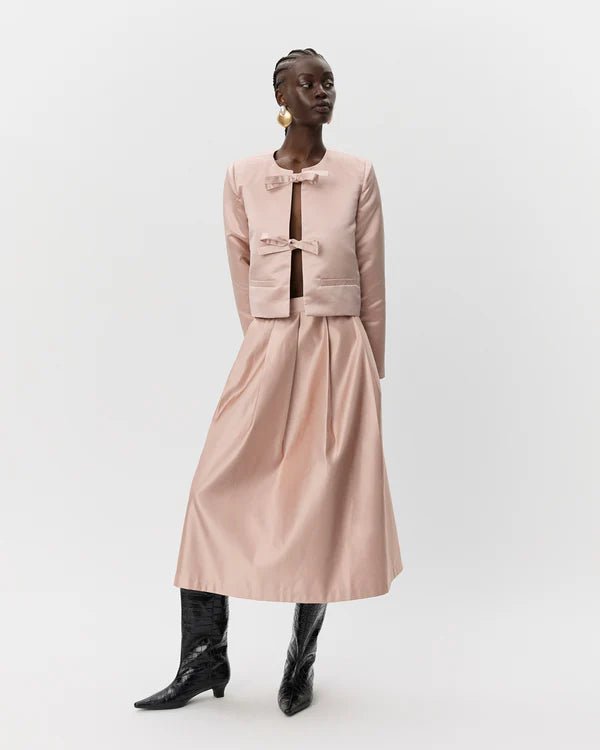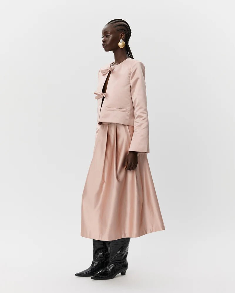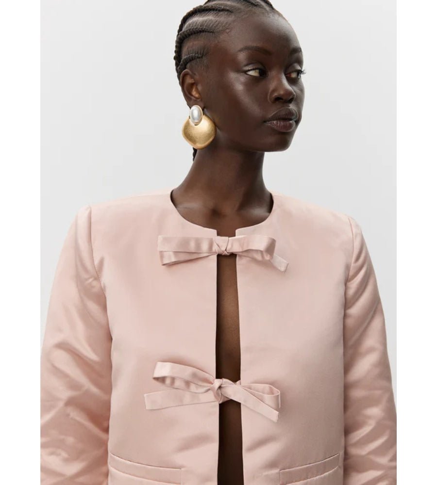 The EverSW Jacket in Blush from Sofie Schnoor offers a chic cropped fit with a subtle matte sheen that feels smooth to the touch. It fastens elegantly with a tie and features long sleeves with playful slits, adding a flirty edge. Designed without a collar and finished with two decorative welt pockets, this jacket blends sophisticated style with a fun, feminine flair perfect for dressing up any outfit.