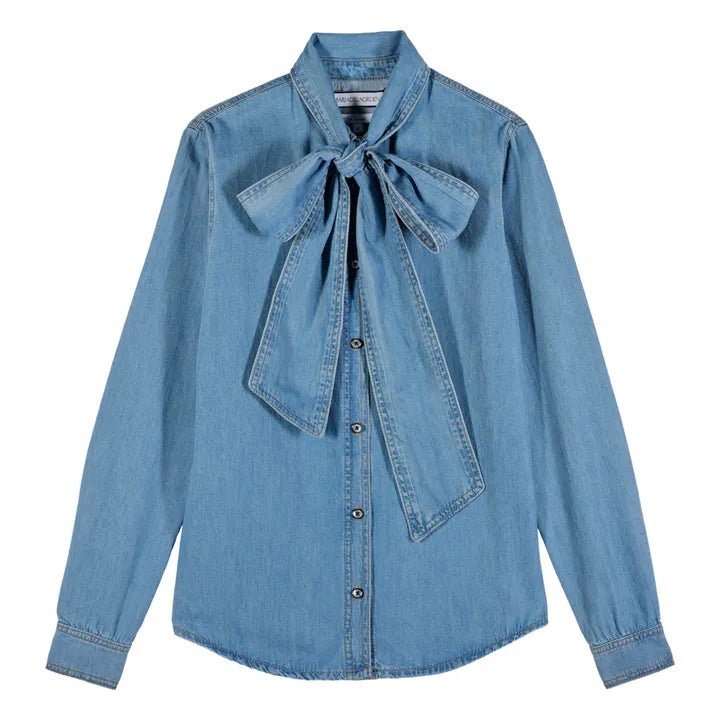Introducing the Fairytale Denim Shirt from Maria De La Orden, where classic meets whimsical! This elegant denim blouse features a show-stopping statement tie bow at the neck that adds instant personality. The fitted silhouette flatters your figure while maintaining that effortlessly cool vibe, and the centre button closure keeps things polished and put-together. Perfect for elevating your everyday look.