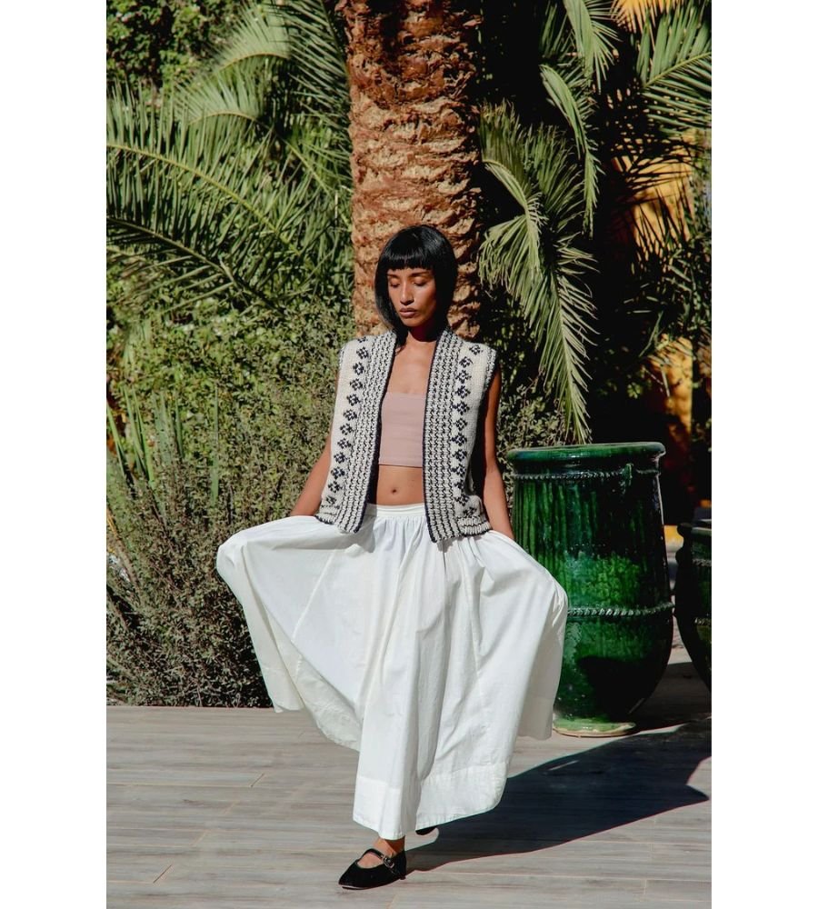 This hand knitted sleeveless cardigan is a refined layering piece to take you through every season. Featuring a sophisticated ivory base with symmetric gold and navy threading details across the front and cinched at the side waist. Slip it on over dresses, shirts, or knitwear for instant polish and understated elegance.