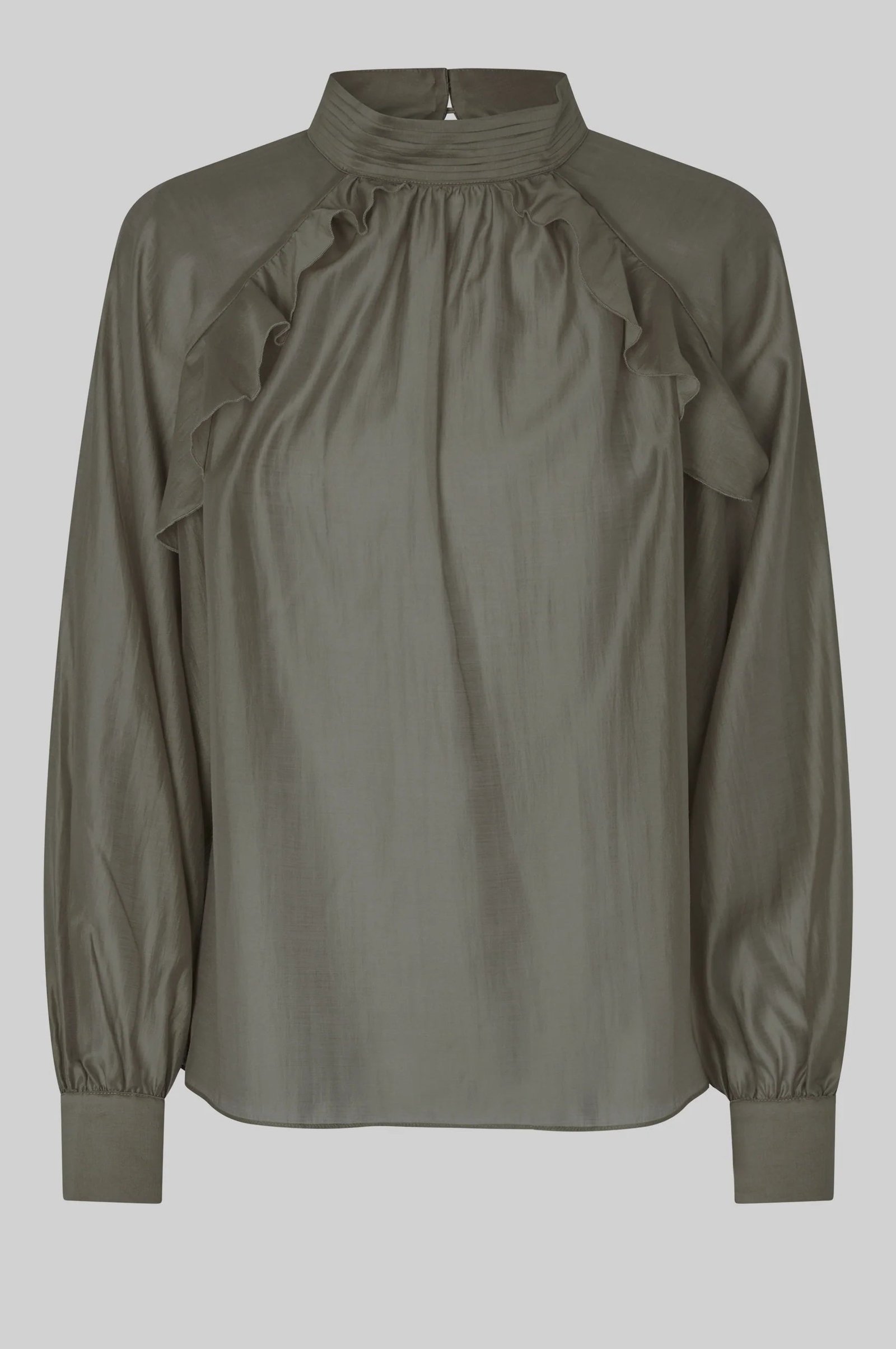 The Kannika blouse by Second Female is the perfect transitional blouse for day to night wear.  Made lightweight, semi-sheer fabric in a pretty dark green colourway. Featuring a stand-up collar and button fastening at back of the neck. Diagonal ruffles across chest. Raglan sleeves with button fastening. Loose, fluid silhouette.  Team with black jeans or a wide leg pair of trousers for the evening.