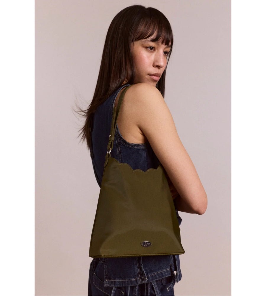 An elevated take on a signature shape. The Lorelai Bag is crafted in premium heavy satin in a rich olive tone, featuring a playful scallop edge. Finished with metal ring details, an oval DM branding plaque, and an internal pocket for everyday essentials. The perfect, lightweight bag for the summer season.