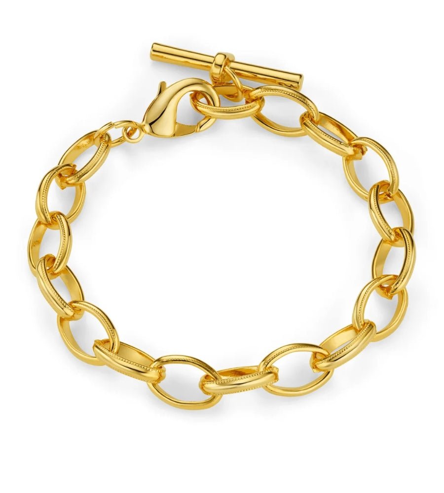 The Oval Link T-Bar Drop Bracelet, is a timeless piece featuring elegant oval links connected at the clasp, with a T-bar drop charm. The drop design adds a touch of movement and security, making it perfect for everyday wear. Lightweight and versatile, this bracelet is easy to layer or wear on its own for a sleek, polished look.
