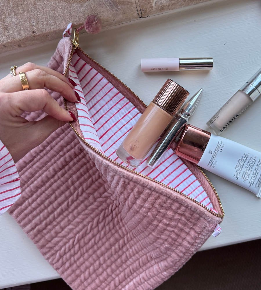 Our large velvet make-up bags will fit all your lotions & potions inside while you are on the go! Made from a beautiful dusty pink velvet with a fun red & white stripe lining. This super useful pouch is quilted and finished off with a little pom pom trim on the zip fastening. An A4 size (8.27 by 11.69 inches).