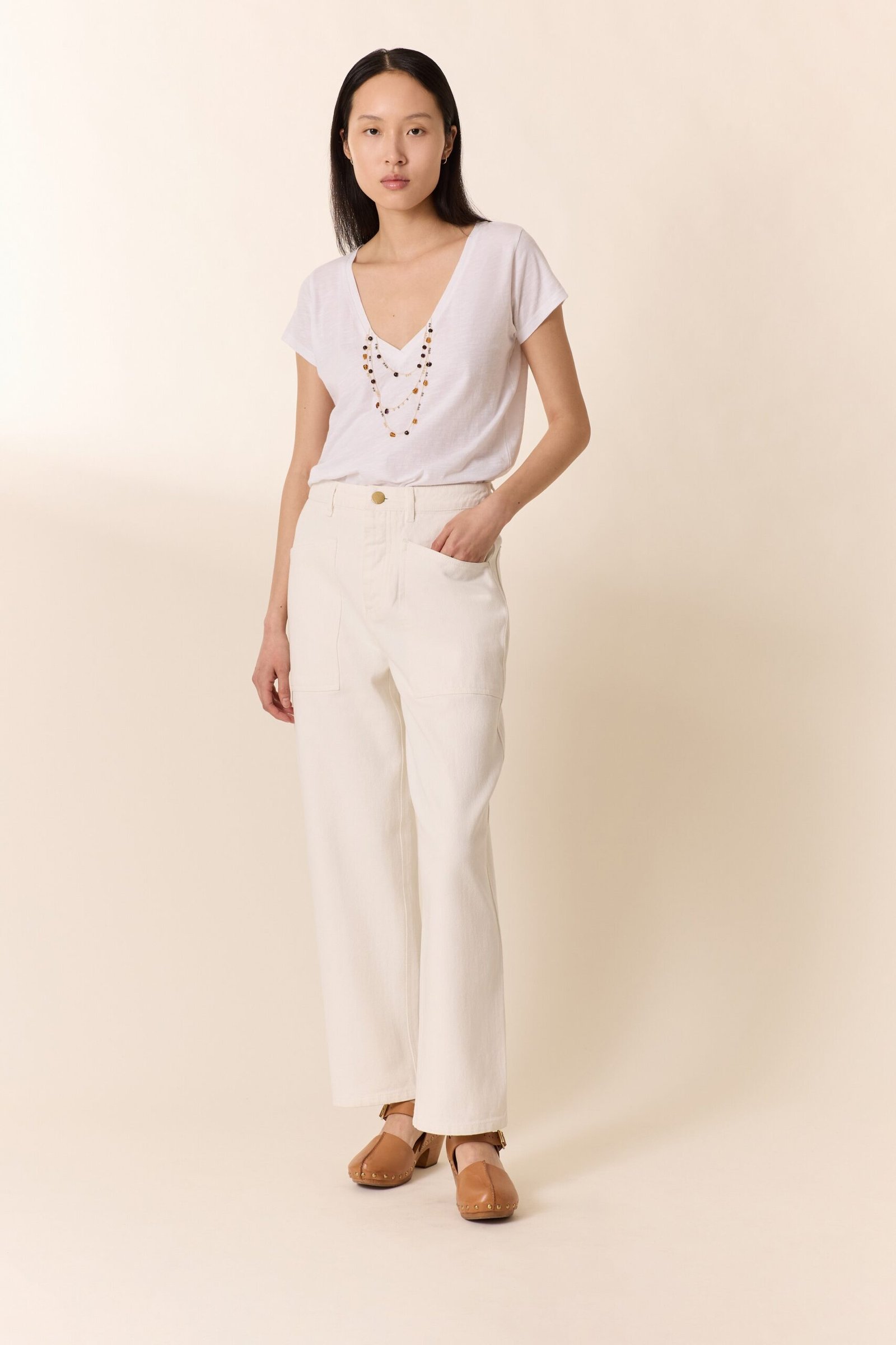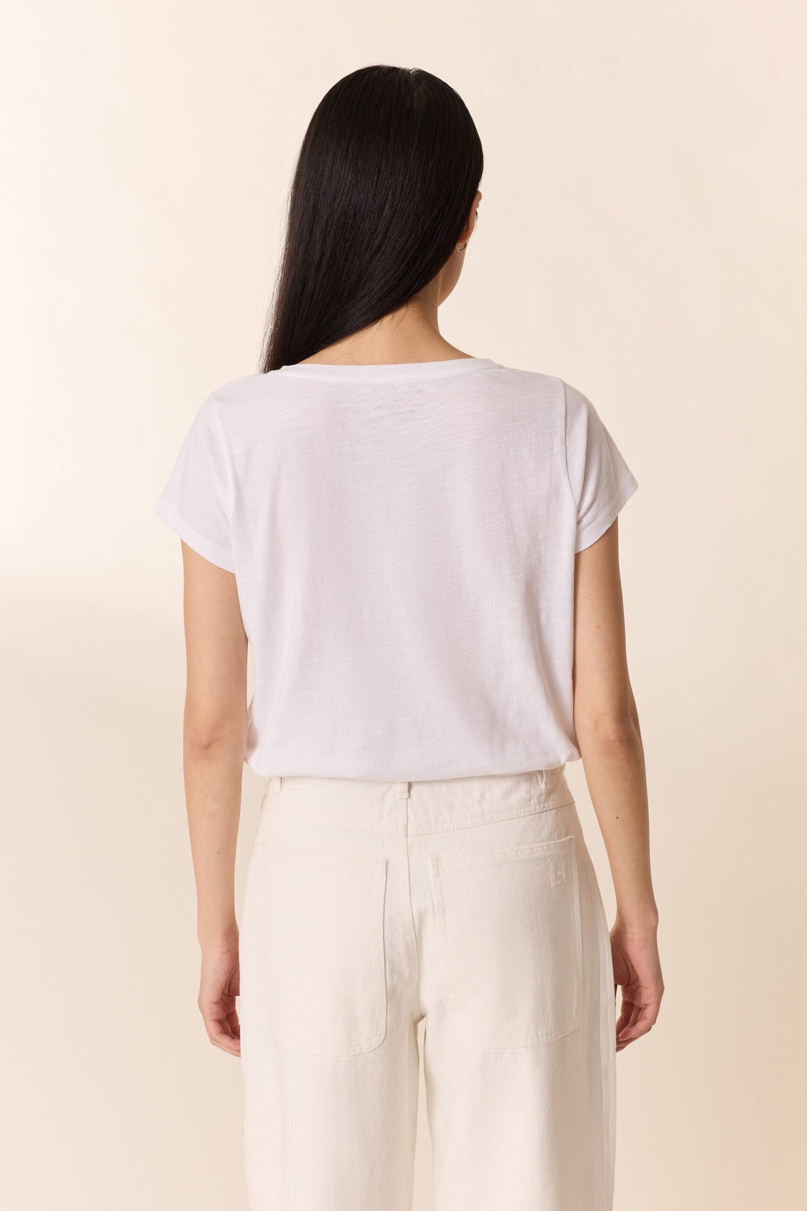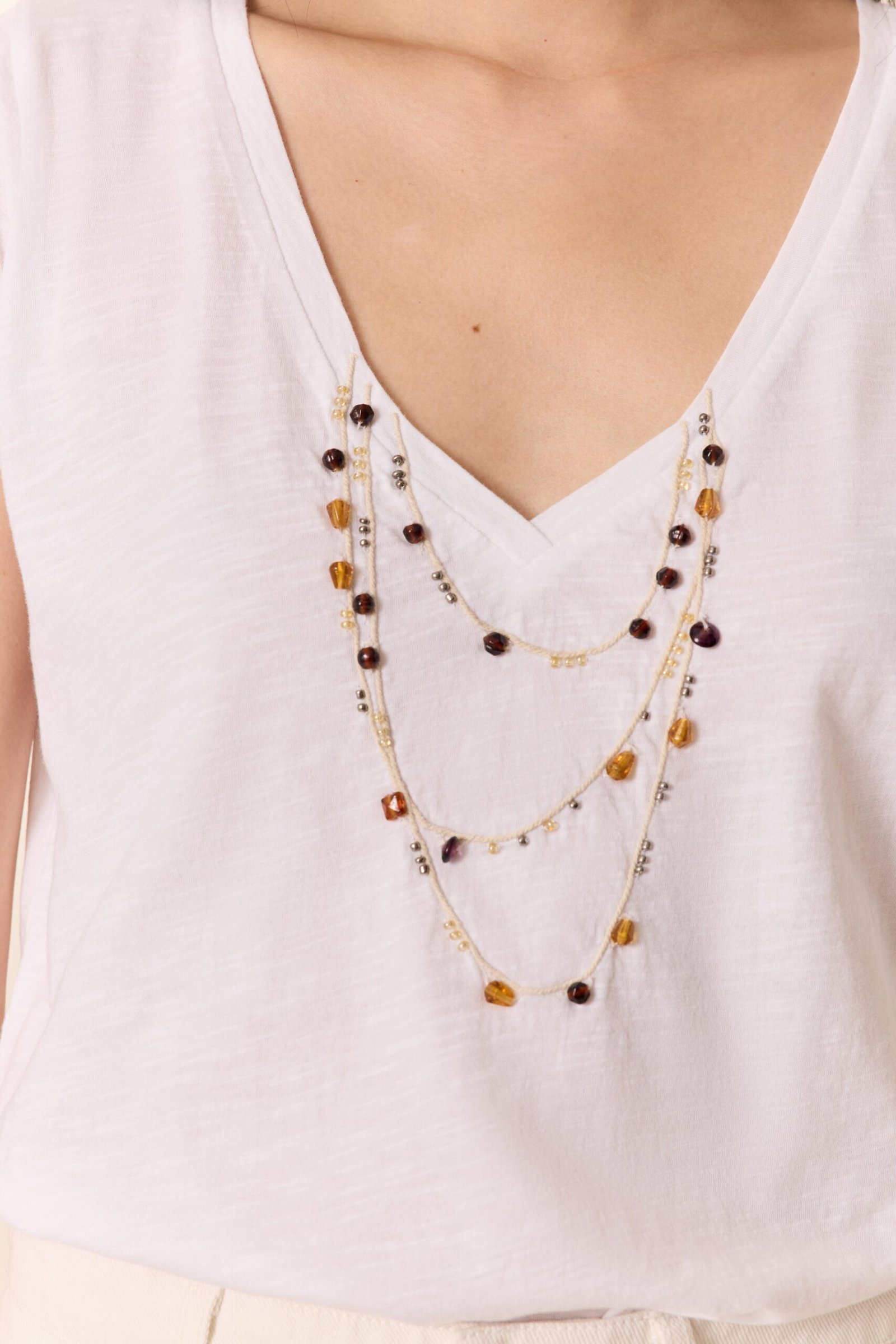 Elevate your everyday basics with this striking white t-shirt, featuring a flattering deep V-neckline and intricate beaded detailing across the front. Crafted from lightweight fabric, it’s perfect for layering or wearing solo during warmer months.