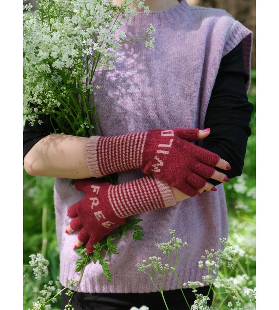 A classic finger-less knitted glove with the words WILD and FREE in chalky pink and a stripe cuff in the same colour. These gloves are great for keeping your hands and wrists warm but your fingers free!