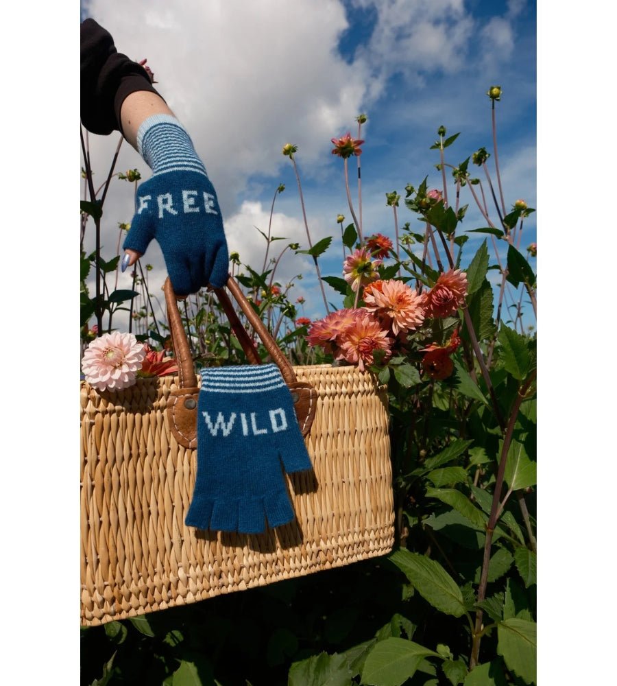 A teal blue finger-less knitted glove with the words WILD and FREE in pale aqua blue and a stripe cuff in the same colour. These gloves are great for keeping your hands and wrists warm but your fingers free for phone use.